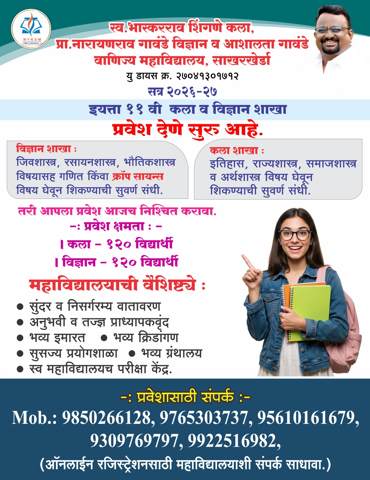 College was Establishes under Nehru Yuva Krida & Sanskrutik Mandal, Chikhli (Dist. Buldana) in year 2000 at remote village Sakharkherda. The college was started B.A. as the main stream in year 2000, affiliated to SGB Amravati University, Amravati. The Commerce and Science stream were started in year 2008, affiliated to SGB Amravati University, Amravati. The college was recognized under section 2(F) and 12(B), by UGC See More...